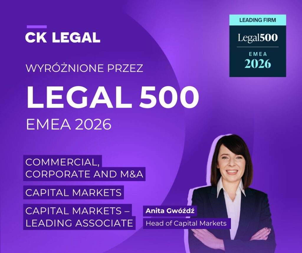 W najnowszej edycji rankingu The Legal 500 EMEA 2026 nasza kancelaria po raz kolejny otrzymała wyróżnienia w obszarach Commercial, Corporate and M&A oraz Capital Markets. To dla nas ważne potwierdzenie stabilnej i niezmiennie wysokiej pozycji CK LEGAL w obszarze transakcyjnym oraz rynku kapitałowego – szczególnie w kontekście pracy dla klientów działających w dynamicznie rozwijających się sektorach, takich jak technologia, fintech, biotech czy software.