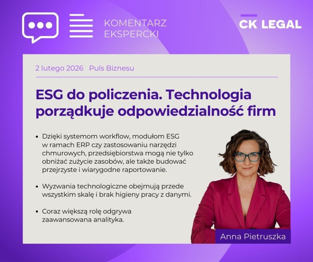 ESG nie działa bez liczb – głos naszej ekspertki w „Pulsie Biznesu”! W nowym tekście pod tytułem „ESG do policzenia. Technologia porządkuje odpowiedzialność firm” znalazł się komentarz Anny Pietruszki z CK LEGAL, w którym zwraca uwagę na kluczowy aspekt wdrażania ESG w organizacjach.