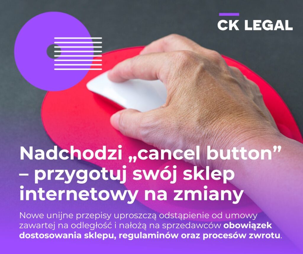 Wyobraźmy sobie świat, w którym odstąpienie od umowy kupna jest tak samo proste, jak jej zawarcie… Ten świat nadejdzie już 19 czerwca 2026 r.! Wtedy sklepy internetowe w całej Unii Europejskiej będą musiały wprowadzić tak zwany „cancel button”, czyli przycisk zwrotu.