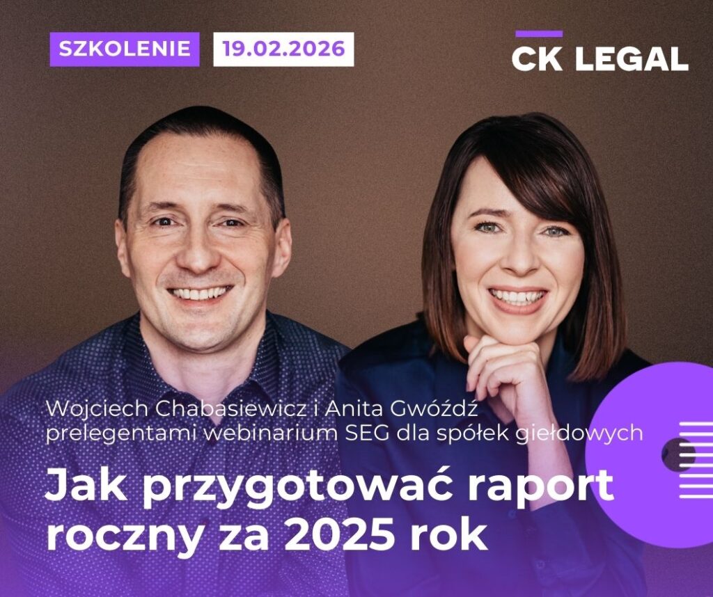 Wojciech Chabasiewicz oraz Anita Gwóźdź z CK LEGAL opowiedzą o tym, jak przygotować raport roczny za 2025 rok. Dowiecie się między innymi, jak zaplanować prace nad raportem, jaki jest zakres ujawnień w sprawozdaniu zarządu oraz kiedy wejdzie w życie – oraz co zmieni – nowe rozporządzenie ws. informacji bieżących i okresowych. Będzie konkretnie, praktycznie i merytorycznie!