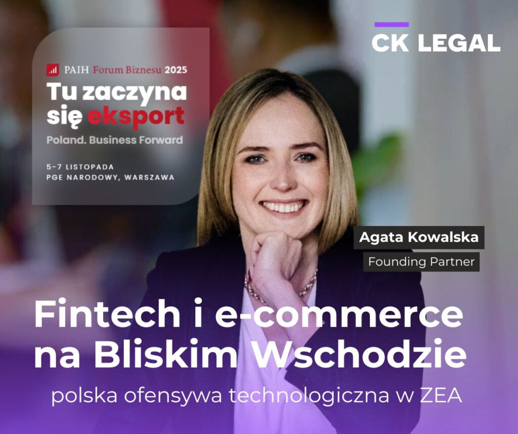 Agata Kowalska z CK LEGAL dołączy do grona prelegentów na wydarzeniu w panelu dyskusyjnym „Fintech i e-commerce na Bliskim Wschodzie: polska ofensywa technologiczna w ZEA”. Zaproszeni eksperci omówią możliwości, które ten rynek stwarza dla polskich firm. Porozmawiają między innymi o barierach regulacyjnych i otoczeniu biznesowym wspierającym innowacje.