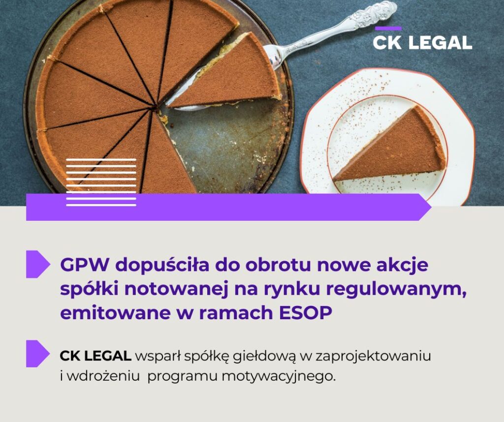 Eksperci z CK LEGAL z powodzeniem wsparli notowaną na rynku regulowanym GPW spółkę w zaprojektowaniu i wdrożeniu programu ESOP kierowanego do kadry zarządzającej, opartego o nowe akcje.